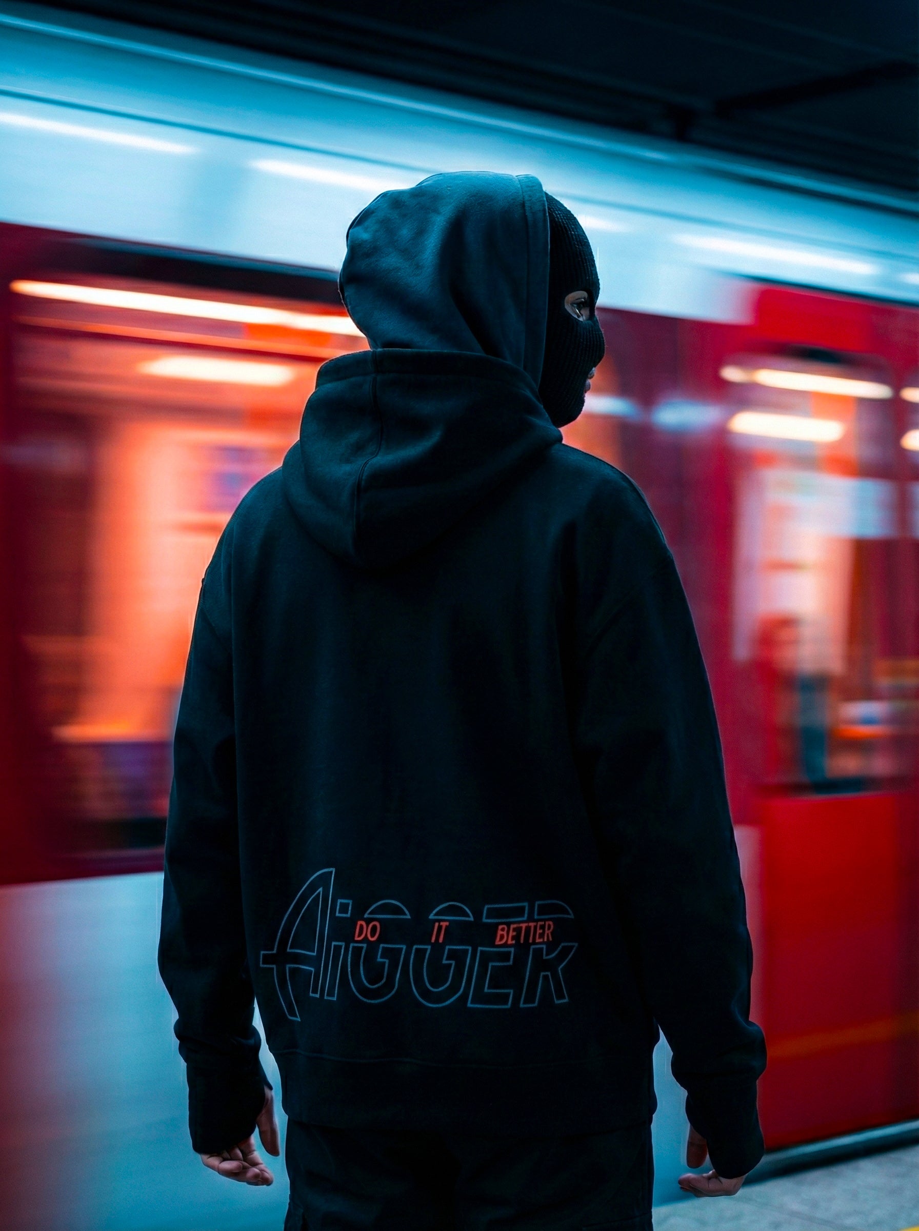 black AIGGER Double cap hoodie.